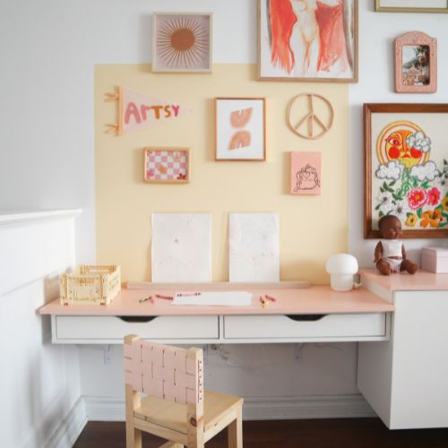 Comme la plupart des parents, notre collaboratrice Vanessa Béland a choisi de rénover son salon pour y concocter un petit coin dédié exclusivement à sa fille. @fleurmaison cherchait à créer un espace de vie polyvalent et qui vieillit bien avec le temps. Pour y arriver, elle a délimité l’espace en créant un mur accent en forme de carré où se trouve le coin enfant. Elle a peint le rectangle avec la couleur de Sico Graine de Millet (6113-32) en raison des propriétés douces et stimulant la créativité de ce jaune pâle. Pour compléter le tout, @fleurmaison a peint les surfaces de travail avec la couleur Rose Rituel (6066-31), ainsi que le meuble télé pour donner une continuité dans le look. Le tour est joué!