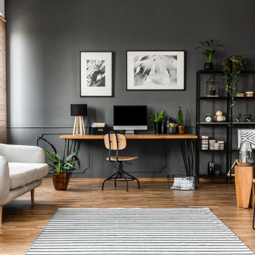 Étant des teintes neutres et passe-partout, le gris pâle et le gris foncé sont des couleurs toutes désignées pour donner toute la place aux éléments décoratifs en bois de votre pièce. Sans toutefois imposer un caractère particulier à la déco, la combinaison de ces deux teintes de gris donnent du style à l’endroit et rendent les accessoires et le mobilier en bois tendances. Dans cet exemple, le regard se pose naturellement vers le rideau, le bureau et la chaise en bois. Voici une combinaison de couleurs Sico pour vous aider à choisir les bons tons de gris à privilégier sur vos murs :