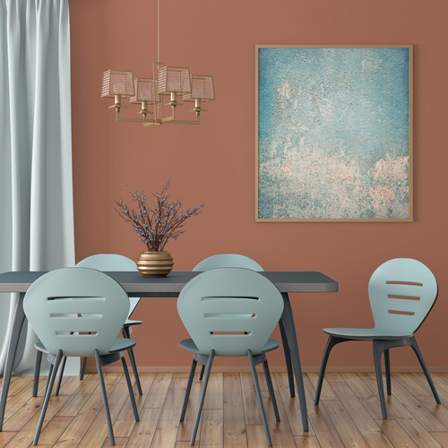 Les couleurs complémentaires sont celles qui se font face dans le cercle chromatique. Ainsi, un bleu turquoise comme Paruline bleue (6160-52) s’agence parfaitement avec un orange terreux comme Pierre d’Acoma (6073-63). Sachant que le turquoise dynamise l’espace lorsqu’il est combiné à des couleurs chaudes et que l’orange aiguise l’appétit, cet agencement sera tout à propos dans la salle à manger. Ajoutez à cela des matériaux vivants comme le bois et vous obtiendrez une ambiance idéale pour casser la croûte en famille!