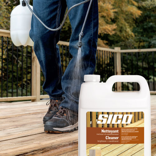 Pour s’assurer d’une bonne pénétration de la surface, nettoyez la surface à l’aide du Nettoyeur, raviveur et conditionneur liquide pour bois extérieur SICO (771-333A).