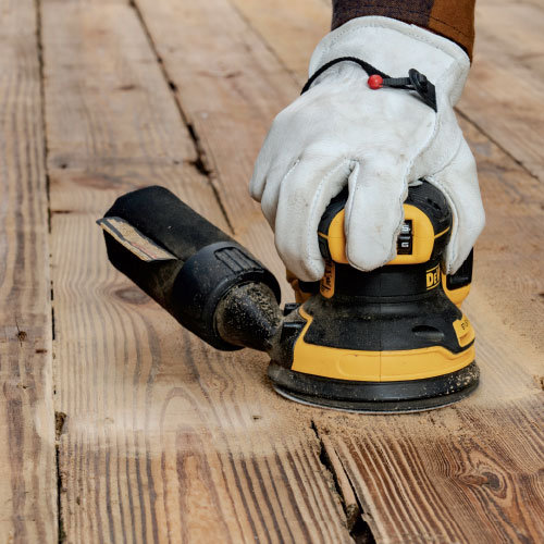 Sablez la surface afin d’ouvrir les pores du bois pour optimiser la pénétration. Utilisez un papier à sabler avec un grain entre 80 et 120 pour les surfaces verticales, et entre 60 et 80 pour les surfaces horizontales.